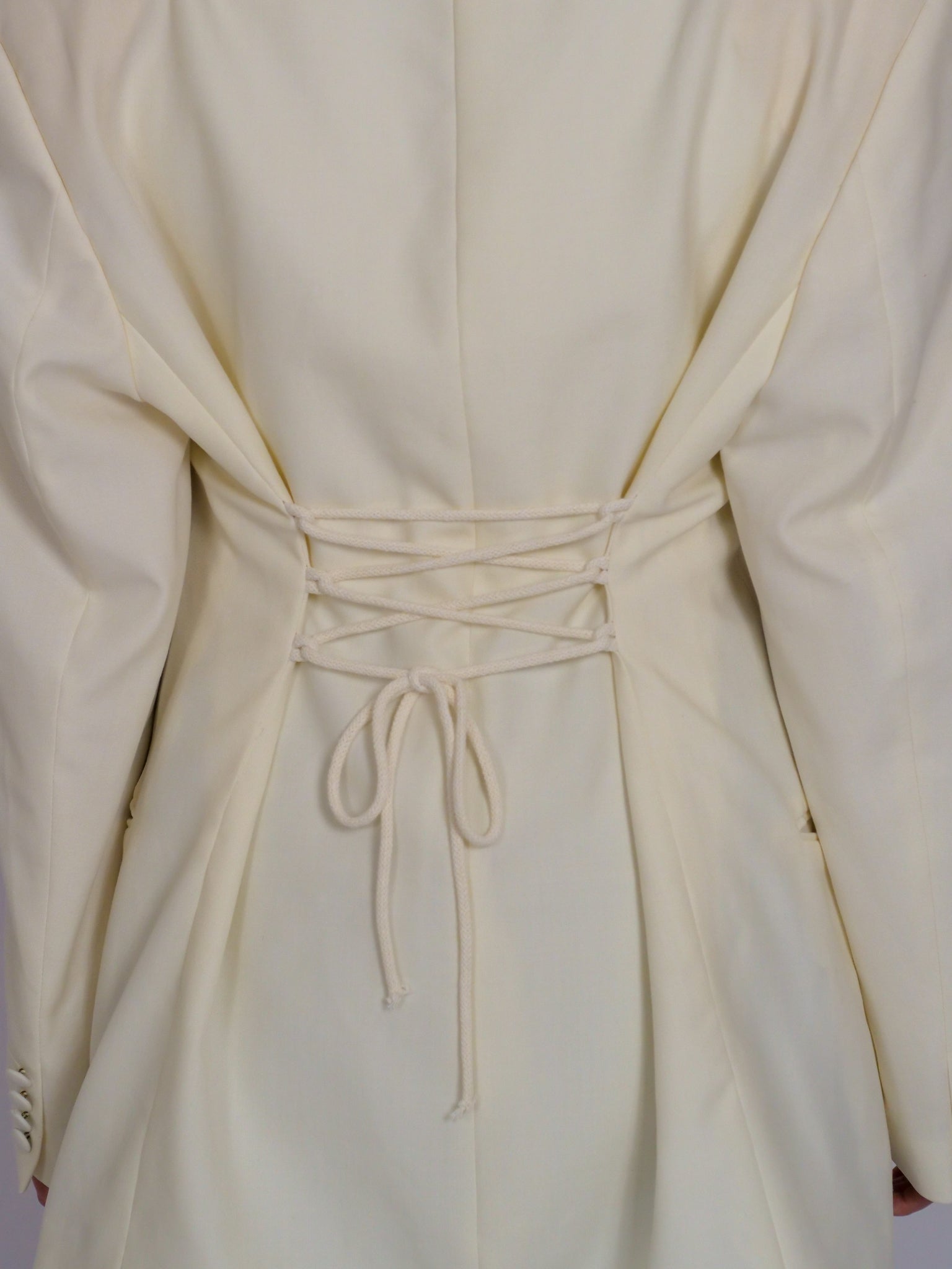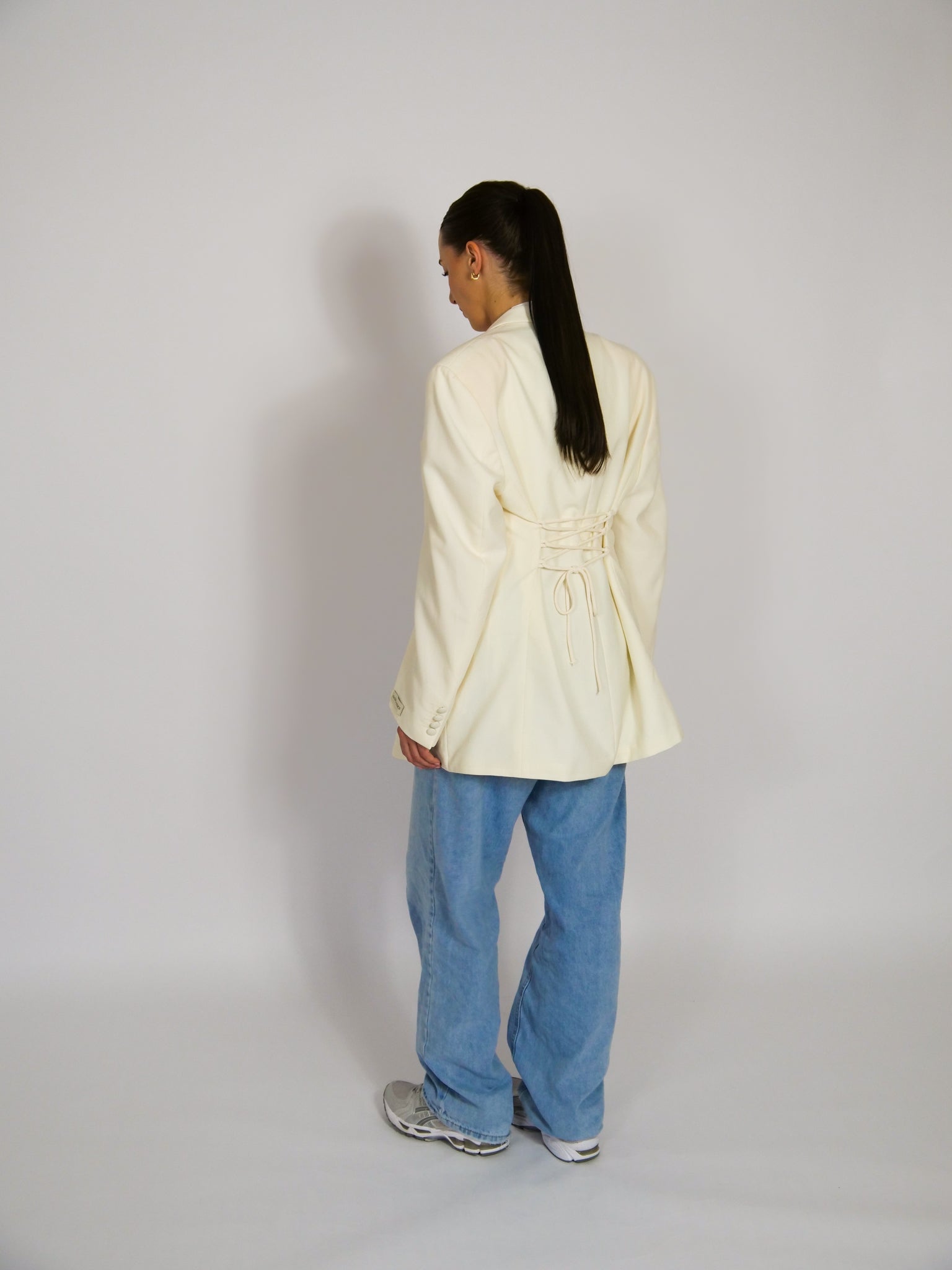 Unieke upcycled vintage blazer, opnieuw ontworpen en met de hand getailleerd. Aan de achterkant is een verstelbaar koordsysteem toegevoegd, waarmee je de taille geheel naar eigen smaak kunt aansnoeren. Dit geeft de blazer een elegante, vrouwelijke shape terwijl de oversized look behouden blijft. De blazer is afgewerkt met ons eigen label als subtiele signatuur.