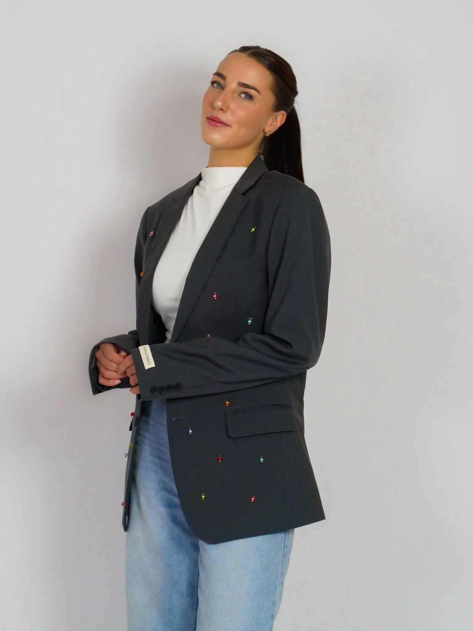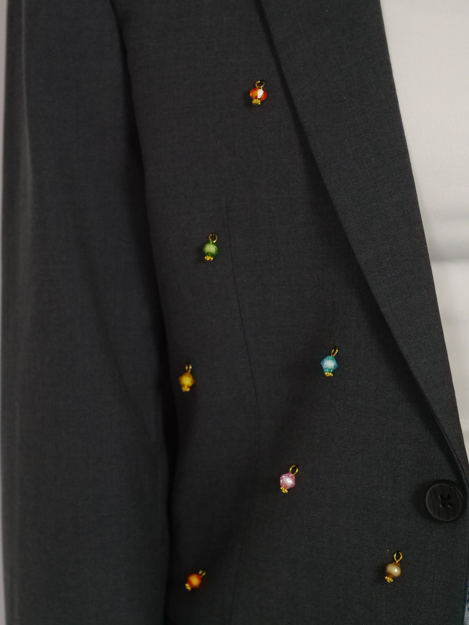 Unieke upcycled vintage blazer, met de hand verrijkt met kleurrijke kralen. Elke kraal is afzonderlijk bevestigd, waardoor de blazer een speelse, luxe en unieke uitstraling krijgt. De subtiele verspreiding van de kraaltjes over de voorzijde zorgt voor een verfijnde maar opvallende look. De blazer is afgewerkt met ons eigen label als subtiele signatuur.