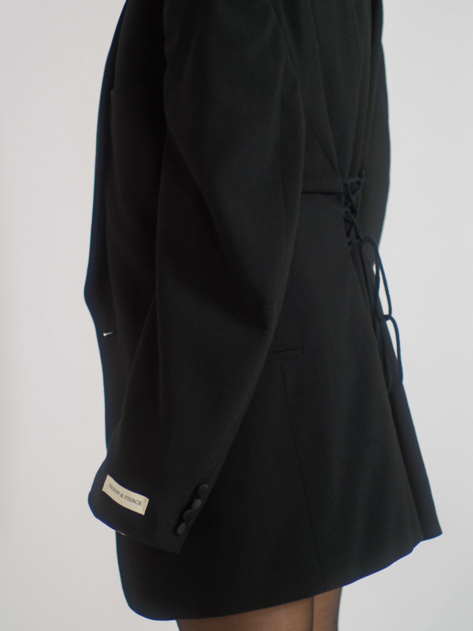 Unieke upcycled vintage blazer, opnieuw ontworpen en met de hand getailleerd. Aan de achterkant is een verstelbaar koordsysteem toegevoegd, waarmee je de taille geheel naar eigen smaak kunt aansnoeren. Dit geeft de blazer een elegante, vrouwelijke shape terwijl de oversized look behouden blijft. De blazer is afgewerkt met ons eigen label als subtiele signatuur.
