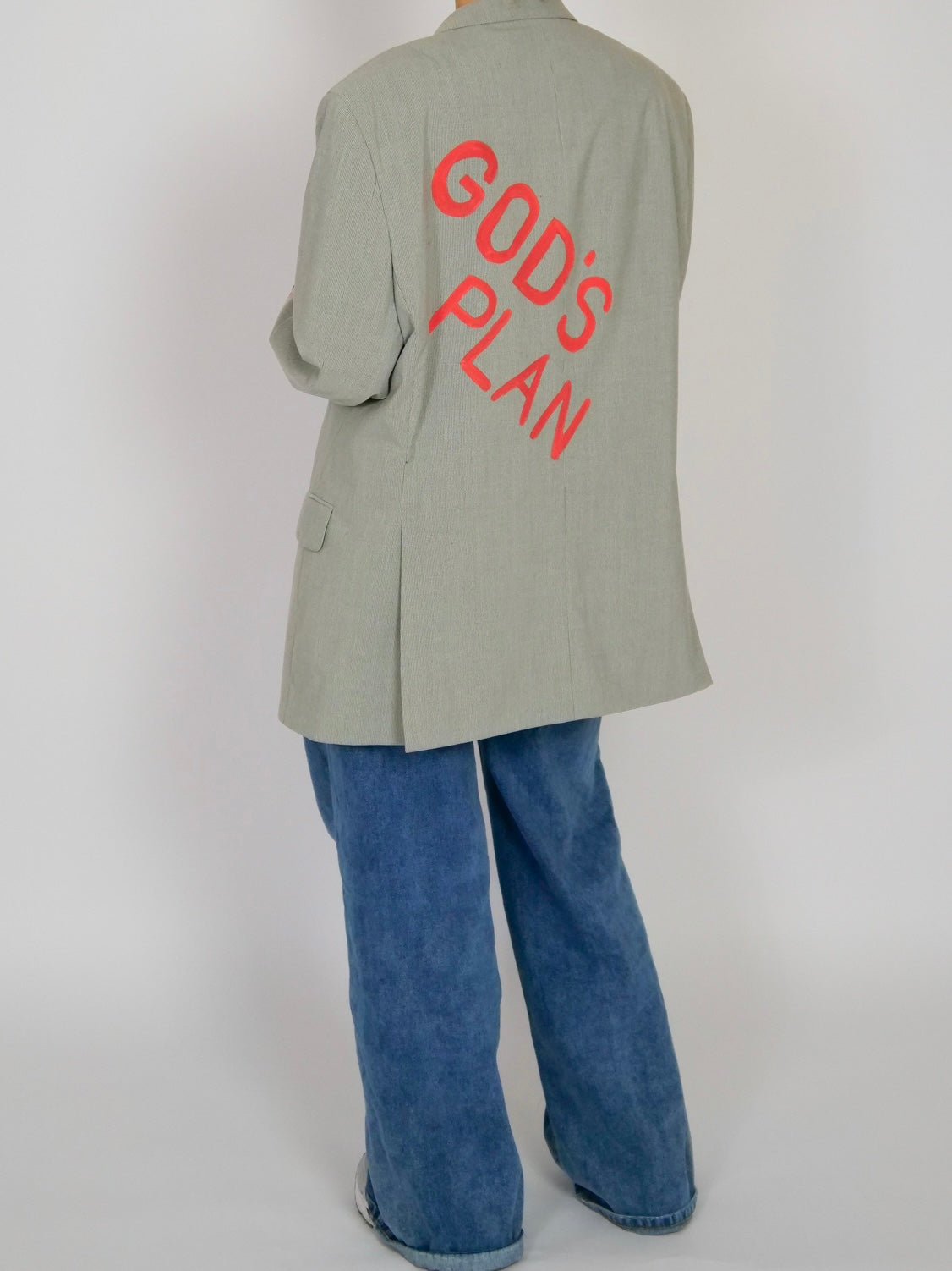 Unieke upcycled vintage blazer, met de hand beschilderd. Op de rug staat de handgeschilderde tekst “GOD’S PLAN”. Op de linker mouw is een handgeschilderd kruis met details aangebracht, afgewerkt met ons eigen label als signatuur.